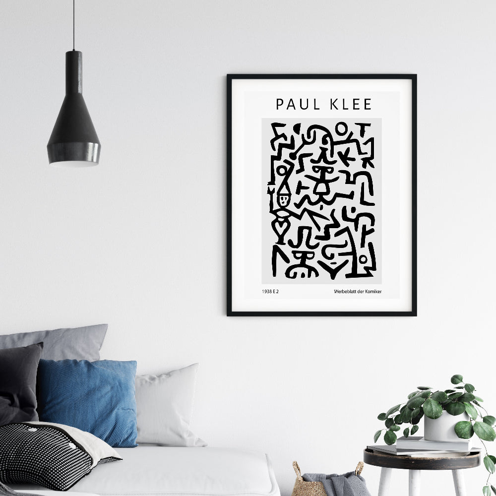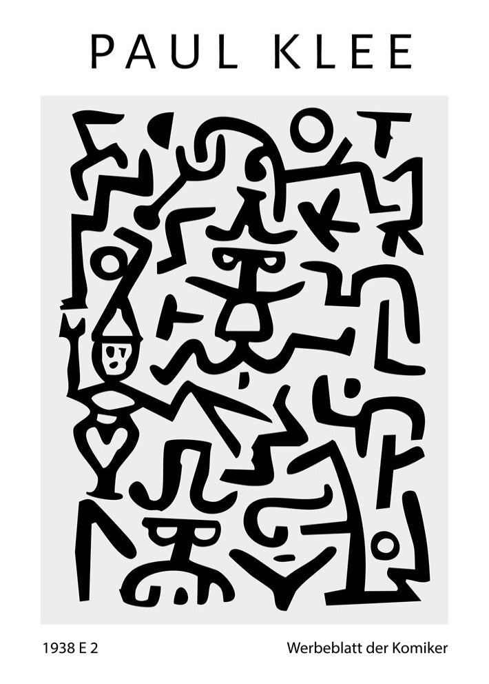Paul Klee painted the 'Comedian's Handbill' in 1938. He uses black pictographs to symbolize movement, frolicking creatures, signs and stick figures. These pictographs are shown on the exhibition style poster against a light beige background.