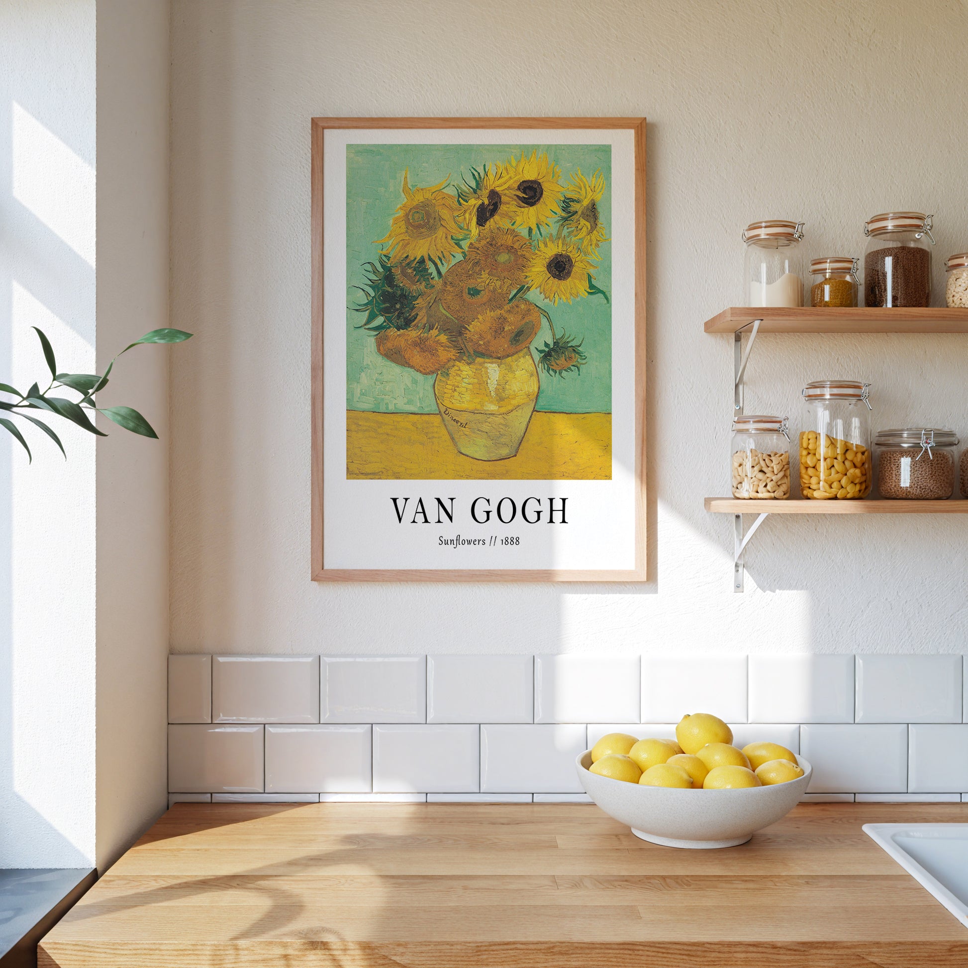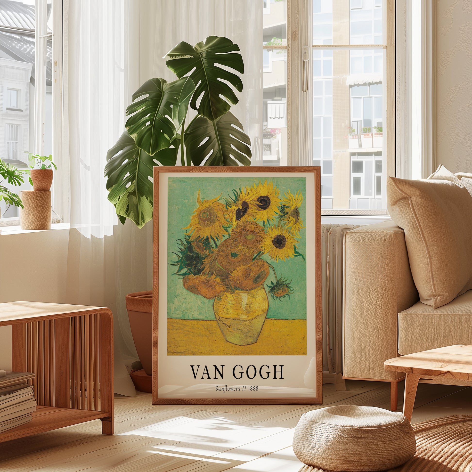 This exhibition-style poster is one of Vincent Van Gogh's 'Sunflower' paintings. Painted in Arles, France between 1988-1989, this still life of sunflowers in a vase, showcases incredible variations of yellow. This version of 'Sunflowers' is shown on a yellow table against a light green wall.