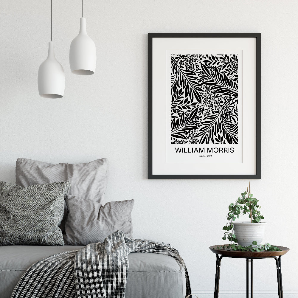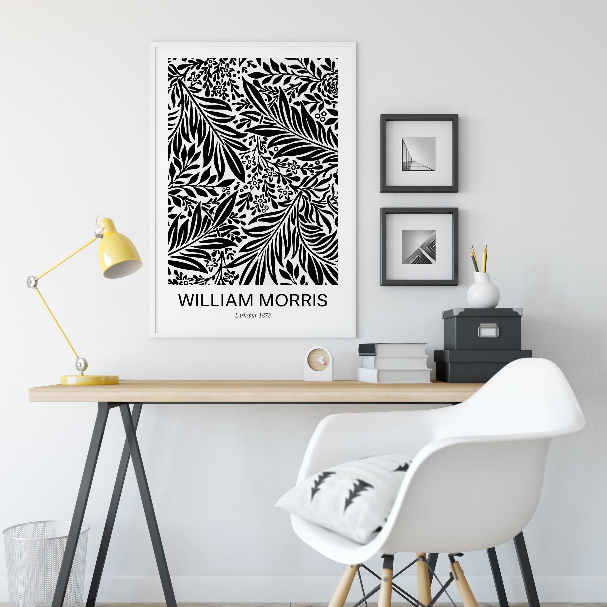 William Morris's "Larkspur" pattern is a classic, botanical design featuring intertwined leaves and flowers. This intricate design in stunning in classic black and white. This pattern was orignally printed by Morris as a design on wallpaper in 1875. This texture is visible in the design.