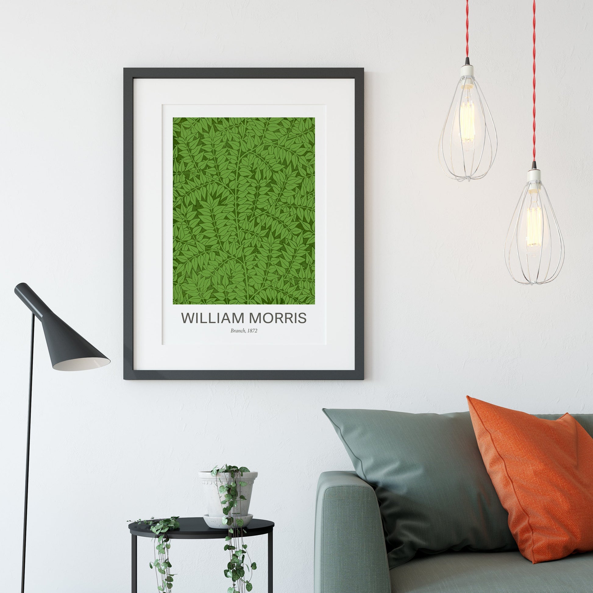 William Morris's "Branch" pattern is a classic, botanical design featuring intertwined leaves and stems.. This intricate design in stunning green brings nature inside. This pattern was orignally printed by Morris on wallpaper using hand-cut woodblocks and natural, mineral-based dyes. This texture is visible in the design.